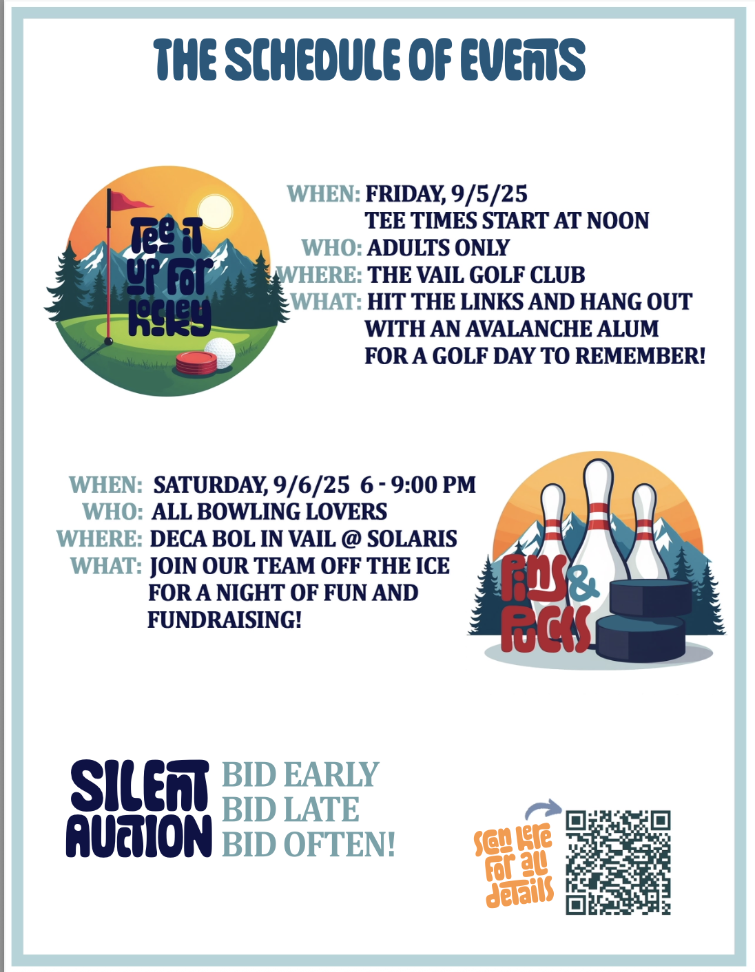 Each year in September, the energy ramps up when we join forces with the Colorado NHL Alumni Association (formerly the Avalanche Alumni Association) to host the Avalanche Alumni Weekend- one of our biggest fundraisers of the year! This unforgettable event goes beyond golf and games. It's a celebration of hockey, a heartfelt giveback from NHL legends to the next generation, and a homecoming for players in the stunning Vail Valley.