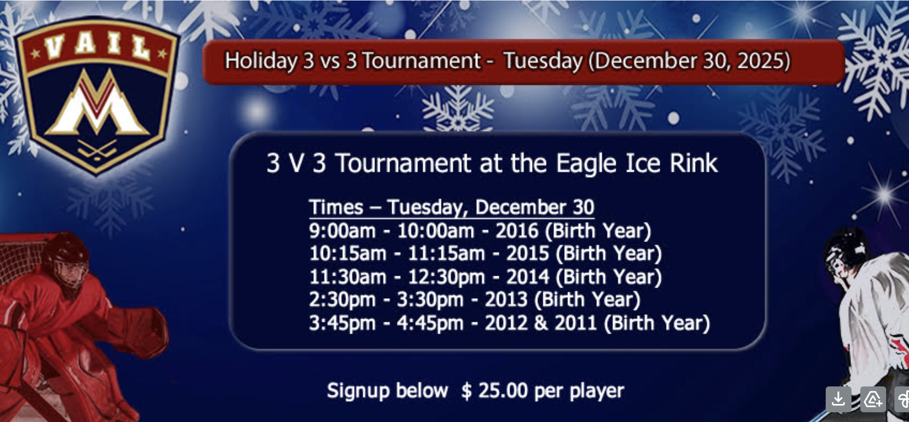 Please join us for a fun-filled 3v3 Holiday Tournament at the Eagle Pool & Ice Rink Tuesday, December 30th.